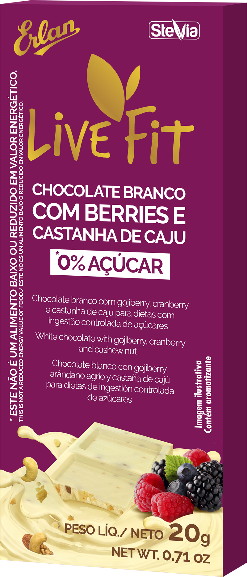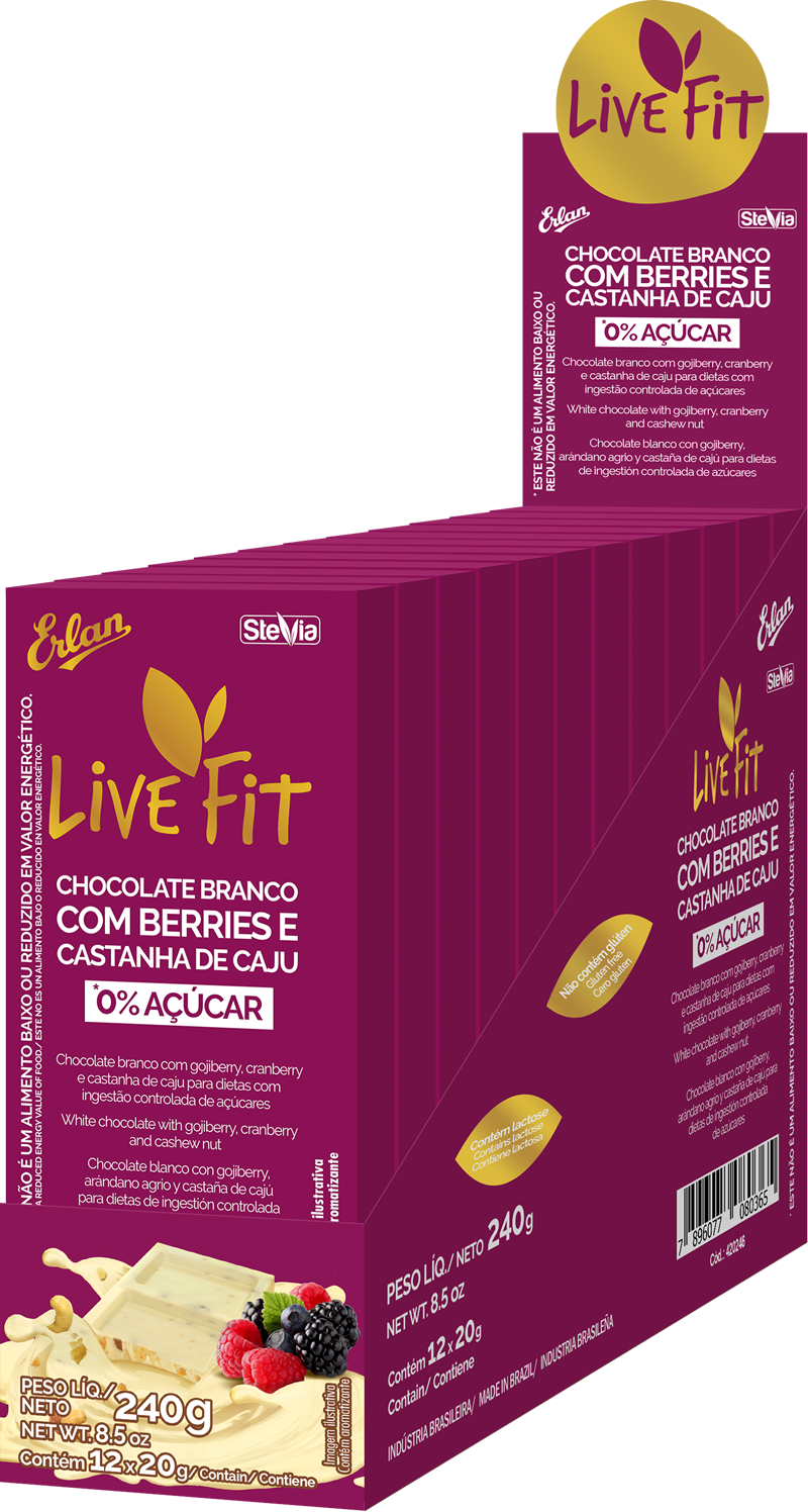 Skimmed milk powder, cocoa butter, cashew nut, gojiberry, cranberry, vegetable fat, sunflower lecithin and polyglycerol polyricinoleate emulsifiers, maltitol and steviol glycoside natural edulcorants, vanilla natural flavour.