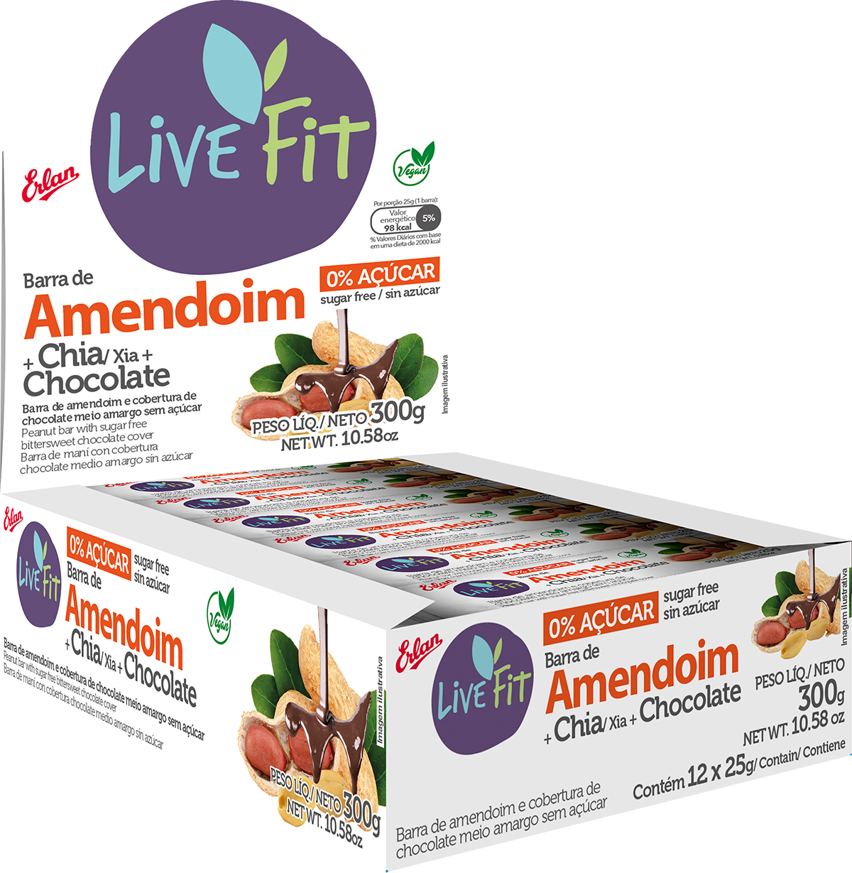 INGREDIENTES: amendoim, sorbitol, maltodextrina, cobertura chocolate meio amargo sem açúcar, goma arábica, farinha de chia, conservante sorbato de potássio, regulador de acidez bicarbonato de sódio e edulcorante artificial sucralose. NÃO CONTÉM GLÚTEN.